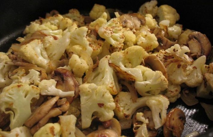 Se potriveste de sare. Se unge cu unt o forma rezistenta la foc, se asaza cateva buchete de conopida intr-un strat cat mai egal, un rand de ciuperci iar deasupra restul de conopida.