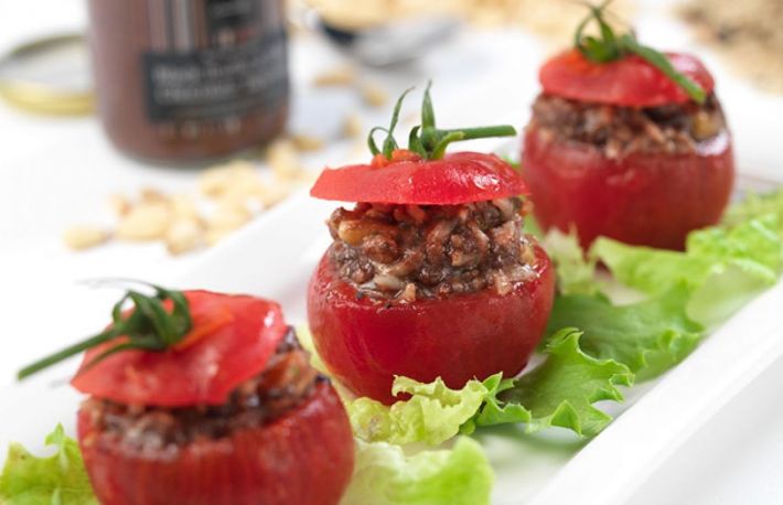 Se aleg rosii netede, frumoase, se taie capacul si se scobesc inauntru. Ficatul se taie felii si se prajeste usor in unt.