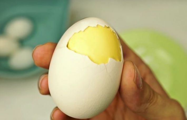 7. Indeparteaza coaja. Vei fi uimit sa observi ca albusul si galbenusul s-au imbinat perfect, iar oul e galben pe toata suprafata! Practic, a devenit omleta inca din coaja!