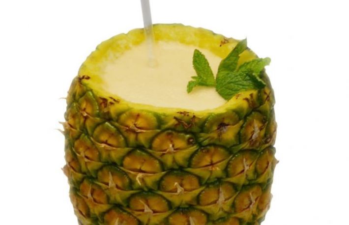 In momentul cand servim se pune ananasul in vasul special pentru cruson, deasupra se toarna zeama de la compotul de ananas, vinul si vinul spumos, care au fost tinute de gheata.
