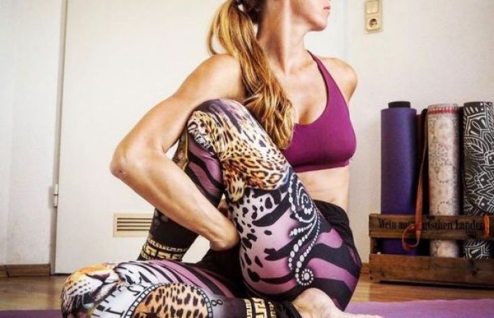 Exercitiul 1. Stai in fund pe podea si indoaie picioarele(cu genunchii spre piept). Sprijinindu-te pe piciorul stang, misca piciorul drept pentru a-l duce pe coapsa stanga, cu piciorul inca indoit. Indreapta bratul drept si coboara-l pe podea. Indoaie bratul stang la cot si aseaza-l pe genunchiul drept. Rasuceste usor capul si corpul spre dreapta. Mentine aceasta pozitie timp de 30 secunde. Repetati si cu piciorul stang.