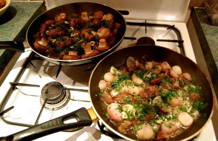 Se inabusa cu putin unt. Se pun in sos cu cateva minute inaintea rinichiului. Se tin pe marginea focului sa se infierbante fara sa fiarba.