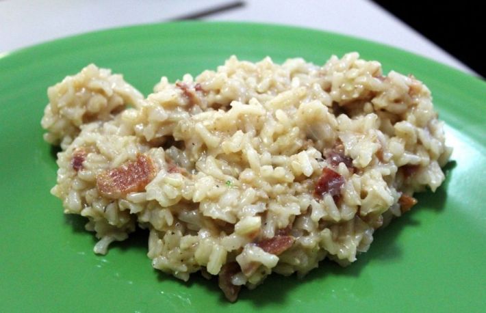 Pentru aceasta reteta cu orez, se foloseste creier de vitel fiert cu ciuperci si sos