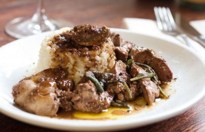 Rizoto cu ficat se poate servi cu sos de rosii sau cu sos de ciuperci la alegere.