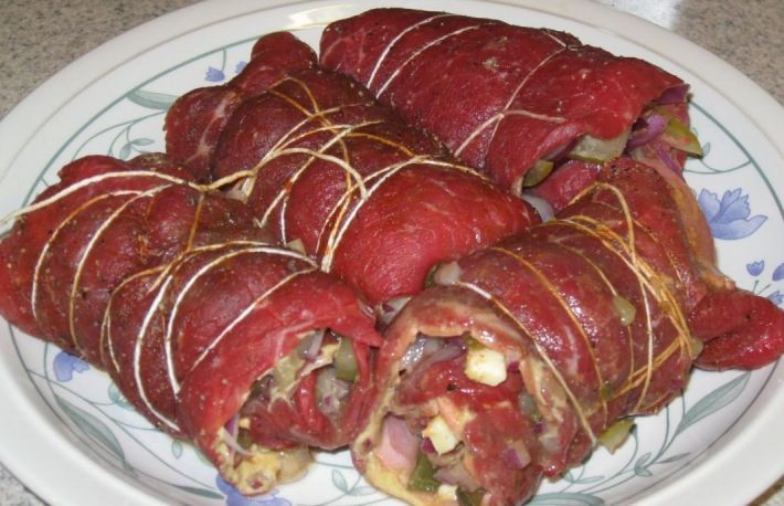 Se taie carnea felii ca pentru snitele, de 1 cm grosime. Se bat feliile de carne cu ciocanul de lemn pentru a se subtia aproape la jumatate, fara insa sa se rupa.