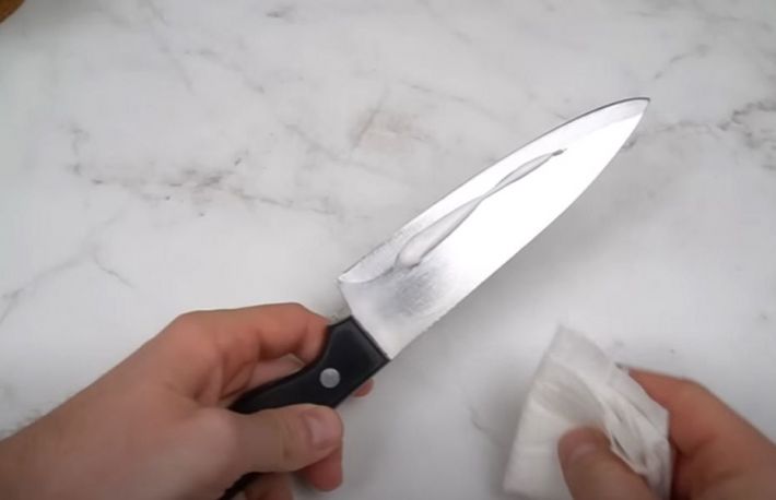 Explicatie: Pasta de dinti contine argint coloidal, o substanta care exercita un efect de frecare foarte bun. Astfel pasta de dinti creste gradul de frecare al lamei cutitului de bucatarie cu obiectul de ascutire(castronul de ceramica).