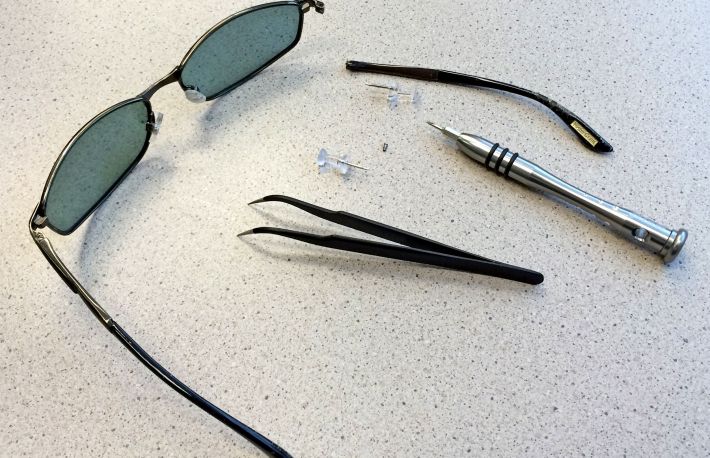 o Puneti la indemana orice fel de Super Glue, hartie cartonata de impachetat sau o foaie de revista, intr-o culoare asemanatoare cu cea a ochelarilor si o foarfeca ascutita.