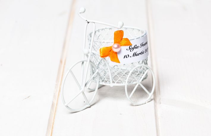 5. Marturii botez sarmulita. Aceste marturii sunt o frumoasa amintire de la botezul oricarui copilas. Fie ca reprezinta o bicicleta, un tort in miniatura, o poseta sau un cosulet, marturiile din sarmulita se ofera invitatilor cu ceva dulce in interior, personalizate cu eticheta.