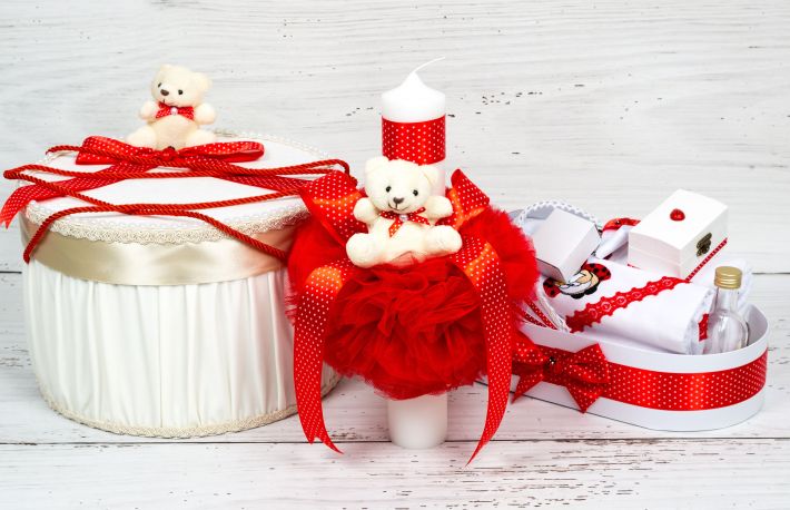 La magazinul de accesorii evenimente SelfEvents.ro toate produsele sunt decorate manual in atelierul propriu cu multa grija pentru detalii. Fiecare set contine o cutie trusou botez rotunda pentru hainute, o lumanare biserica a carei flacara va fi mentinuta aprinsa pe toata durata evenimentului si un trusou. Trusoul biserica este la randul sau compus din: