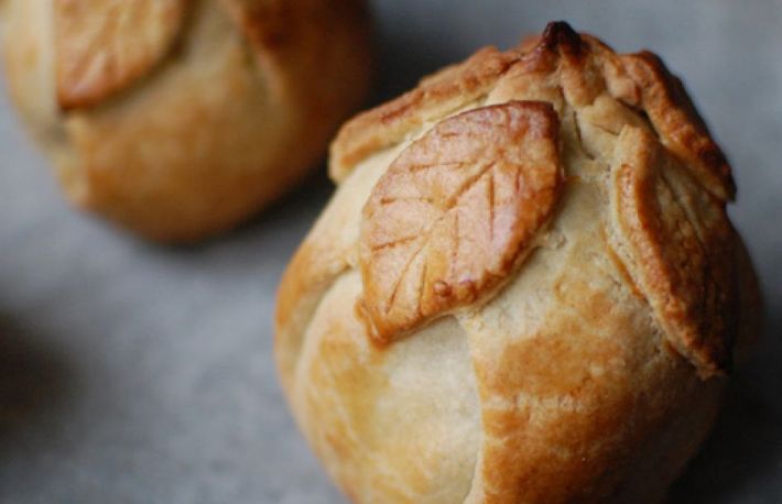 Se pune cate un mar pe fiecare patrat, se aduc colturile spre mijloc, marul inchizandu-se ca intr-o punga.