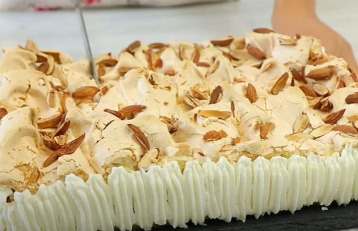 - fa un ornament cu lingurita peste bezea, care sa fie asemanator cu niste munti. Presara bezeaua cu migdale tocate marunt, arahide maruntite sau fulgi de migdale;