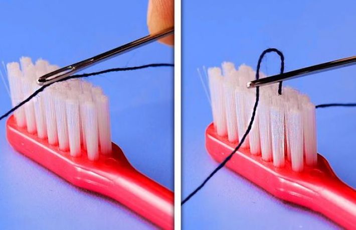 Foloseste o periuta de dinti pentru a introduce ata in ac. Daca nu vezi bine sau nu ai rabdare sa introduci ata in ac, iti poti simplifica sarcina cu ajutorul unei periute de dinti scaose din uzul clasic. Pune firul de ata pe dinti periutei, apoi impinge ochiul acului in zona in care se afla ata. Firul va intra rapid prin ochiul acului!