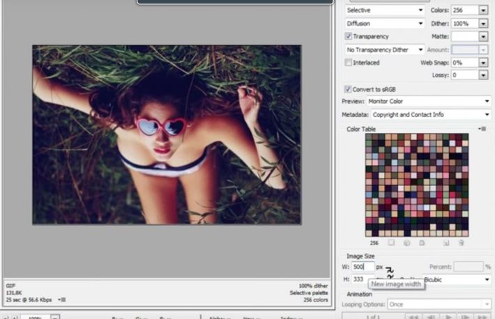 In Photoshop e un pic mai complex procesul, dar nu dificil. Incarci poza dorita cu Open. Apoi apesi File, Save for web si se va deschide o alta casuta. In dreapta jos ai optiunea Image size de unde vei alege noile valori pentru fotografia ta.