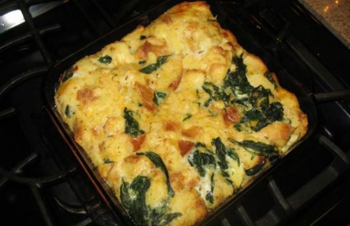 Budinca de spanac este o reteta delicioasa daca adaugati la ea 3-4 felii de mezel pentru gust.