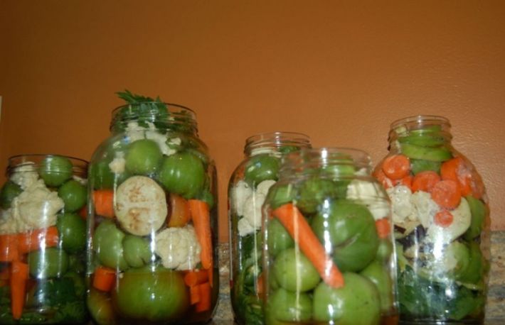 Se asaza toate in butoi, in proportiile dorite, se adauga cateva fire de marar uscat si frunze de visin care tin muraturile tari, iar deasupra se toarna saramura clocotita, facuta din 500 g de sare la 10 l de apa.