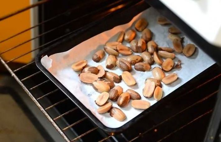 - prajeste ghindele in cuptor la 177 grade Celsius timp de 15 minute. Preincalzeste cuptorul la si pune ghindele pe o tava de copt. Introdu tava de copt in cuptor. Verifica fructele dupa un sfert de ora pentru a vedea daca si-au schimbat culoarea. Sunt facute cand devin intunecate;