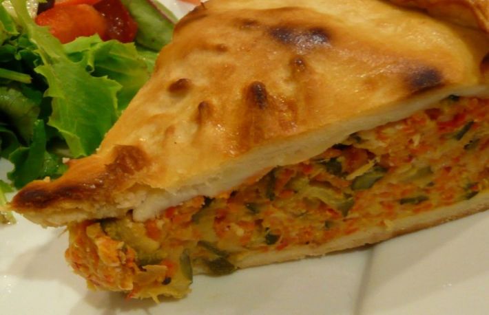 Se unge cu untura o forma rezistenta la foc, se asaza un rand de felii de cartofi, un rand de felii de dovlecei, unul de felii de oua rascoapte, se presara branza, putina verdeata si din nou cartofi, dovlecei si oua.