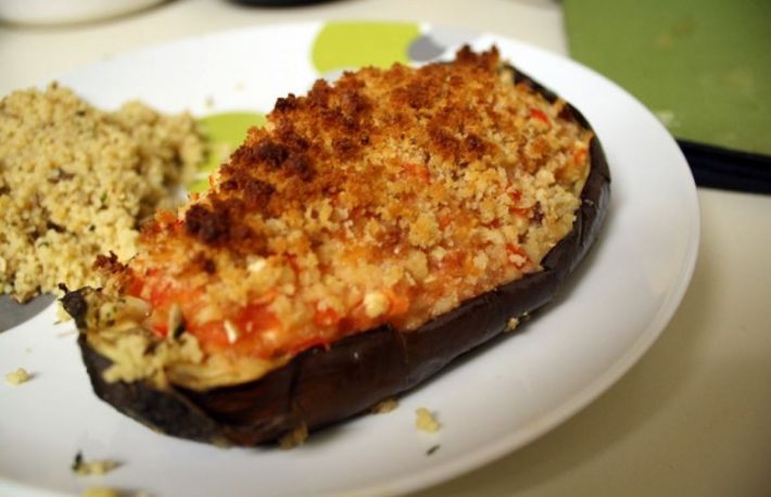 Se unge cu ulei o forma de pamant cu margini joase, se asaza vinetele; cu o lingura se pune umplutura in fiecare, se presara pesmet, se da la cuptor la foc potrivit.
