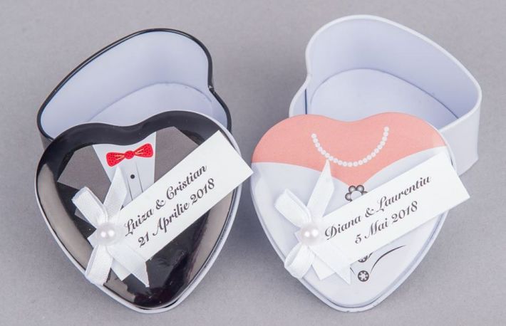 Marturii nunta cutiute metal. Spre deosebire de cutiutele din carton, acestea sunt rezistente si pot fi pastrate ani intregi goale sau umplute cu bomboane, pastile, gume de mestecat etc.