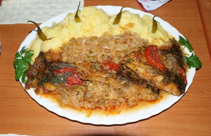 O reteta traditionala din Delta Dunarii ce se preteaza cu mamaliga este crapul la cuptor pe varza.