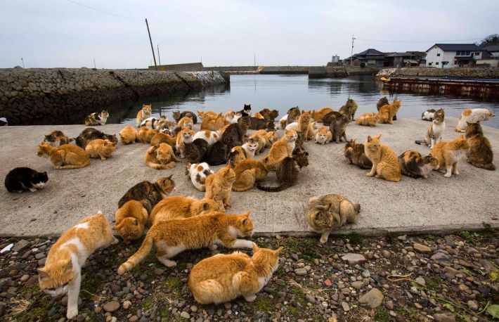 Insula pisicilor din Tashirojima, Japonia. Insula s-a umplut de pisici datorita unei credinte locale, care spune ca hranirea acestor mici feline inseamna bogatie si noroc. In prezent, pe insula traiesc mai multe pisici decat oameni...